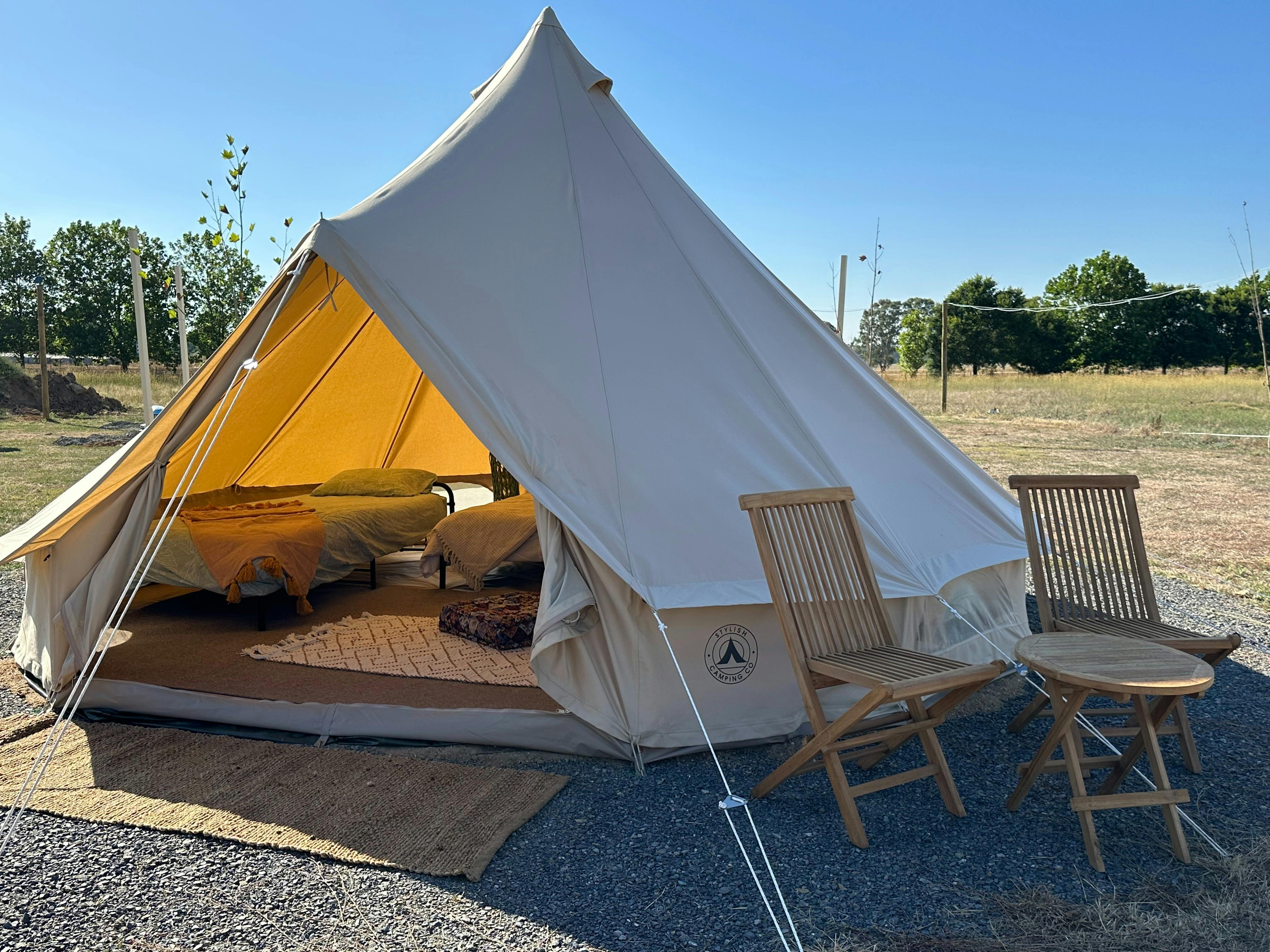 Each site features facilities including 5-metre premium bell tents, a double bed, solar power and lighting with one 10-amp power point, USB port for phone charging, and 12v DC, quilts, linen, pillows, bath towels and face towels, a solar-powered evaporative cooler system (for summer use), and a table and chairs.