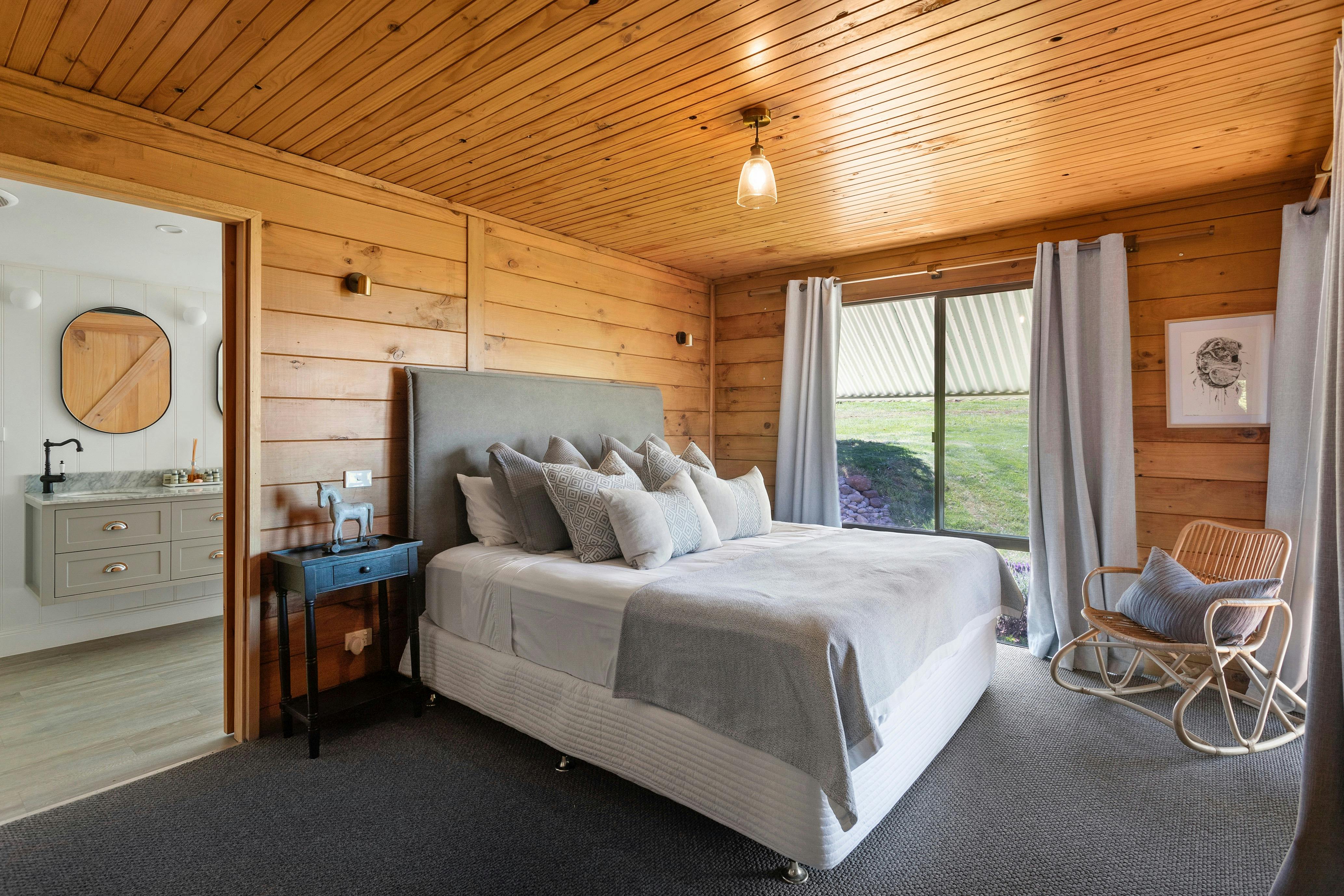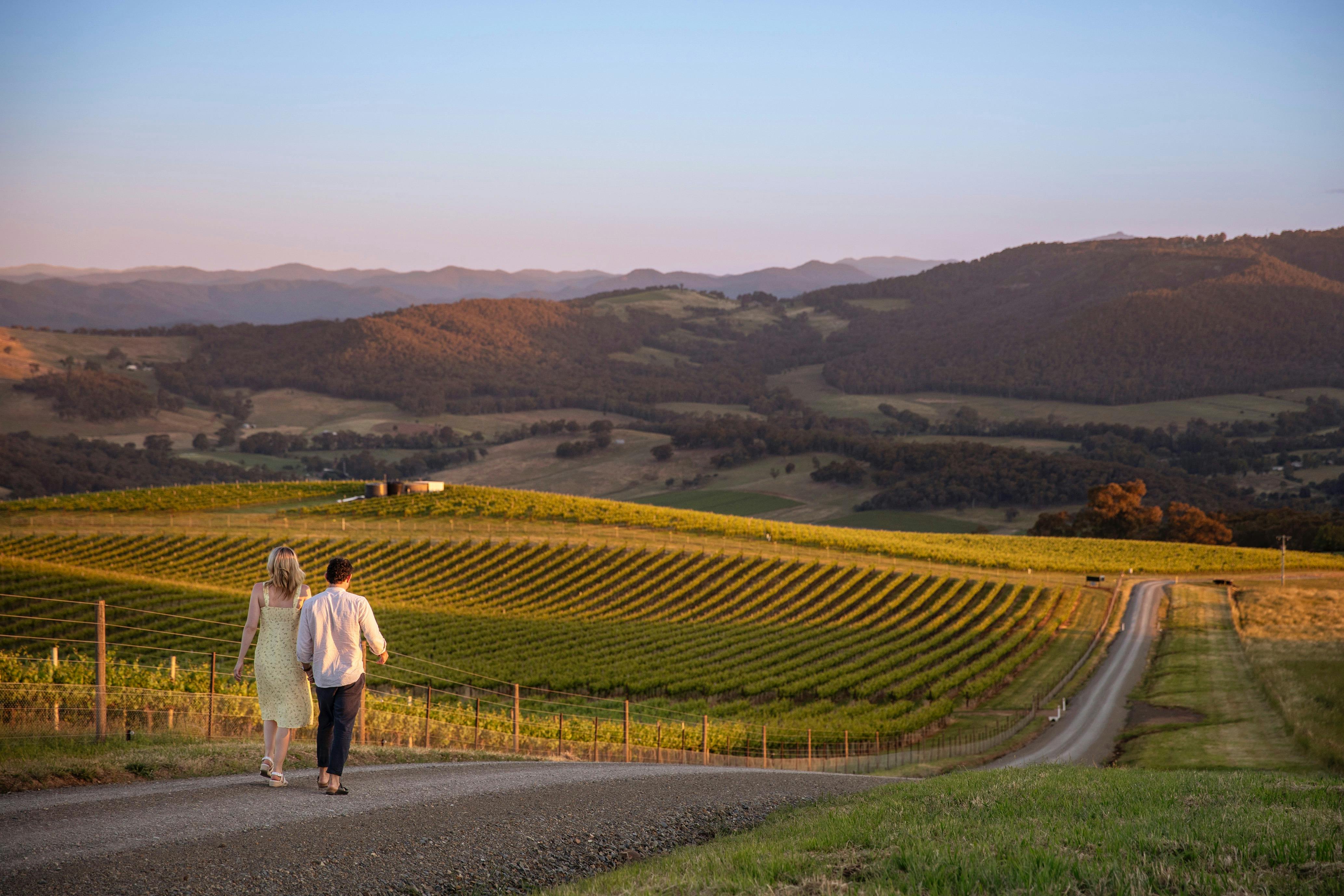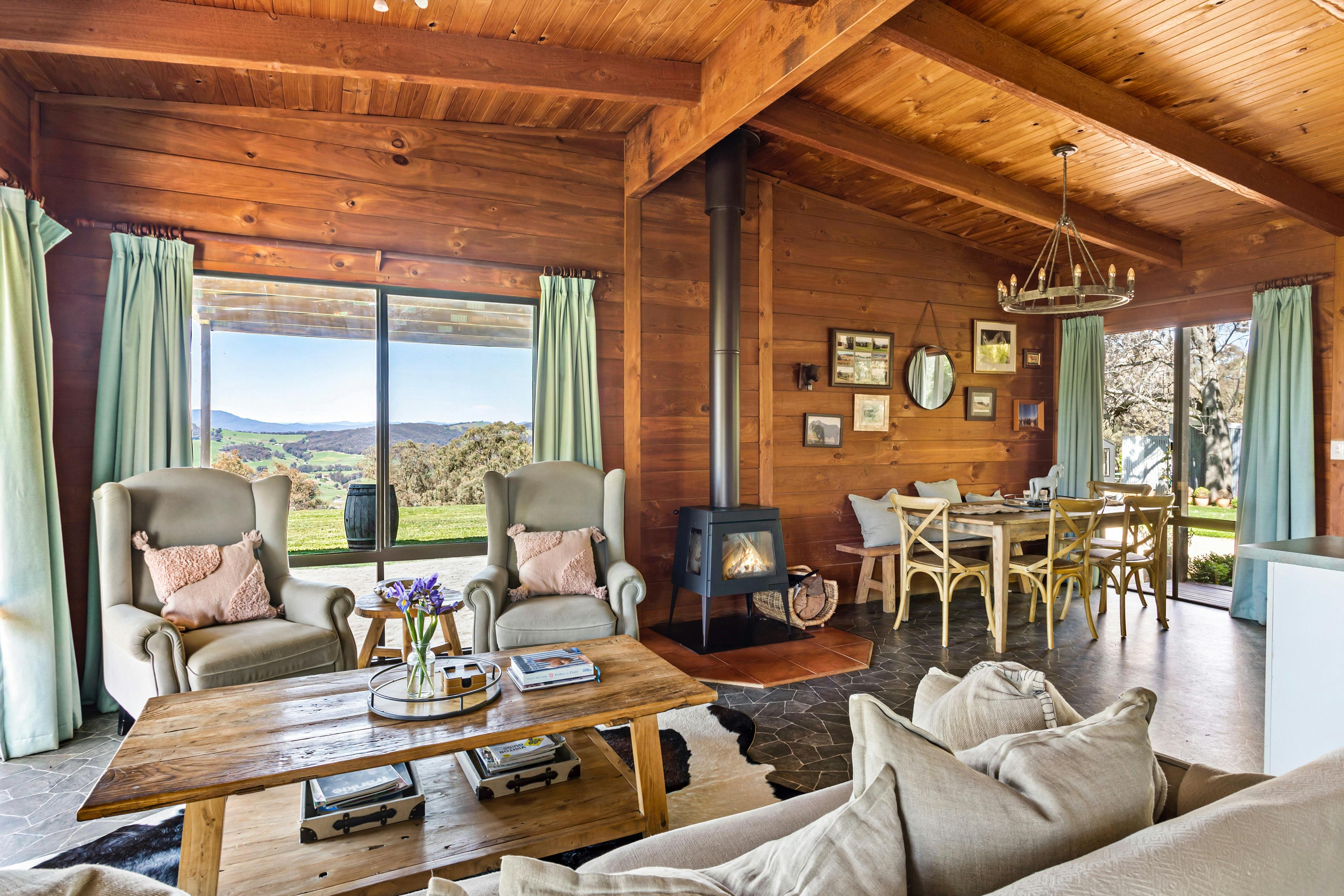 Perched high in the heart of the King Valley, Mt Bellevue is one of Victoria's most breathtaking farms and vineyards, offering truly memorable King Valley accommodation. From its elevated position, the property commands sweeping, uninterrupted views across Myrrhee and the King Valley to Mount Buffalo and the snowfields of the Victorian High Country — vistas that stay with you long after your visit. This is a place to slow down and reconnect. Spend your days breathing in crisp mountain air, watching local wildlife wander through the landscape, and your evenings beneath brilliant, star-filled skies. A stay at Mt Bellevue offers a rare opportunity to experience the beauty and rhythm of life on a working vineyard. The Lodge at Mt Bellevue is a charming three-bedroom red cedar alpine home, rich in warmth and character. Positioned along the ridge, it enjoys panoramic outlooks across rolling valleys and distant peaks, placing you amongst some of north-east Victoria's most spectacular scenery. Surrounded by expansive lawns and nestled just below the vineyard, The Lodge is ideal for a romantic escape or relaxed family getaway. Amenities include a cosy fireplace, air-conditioning, alfresco outdoor entertaining with barbecue, and a master bedroom with king-size bed and ensuite overlooking the vines. Fully self-contained and wonderfully private, it invites you to unwind at your own pace.