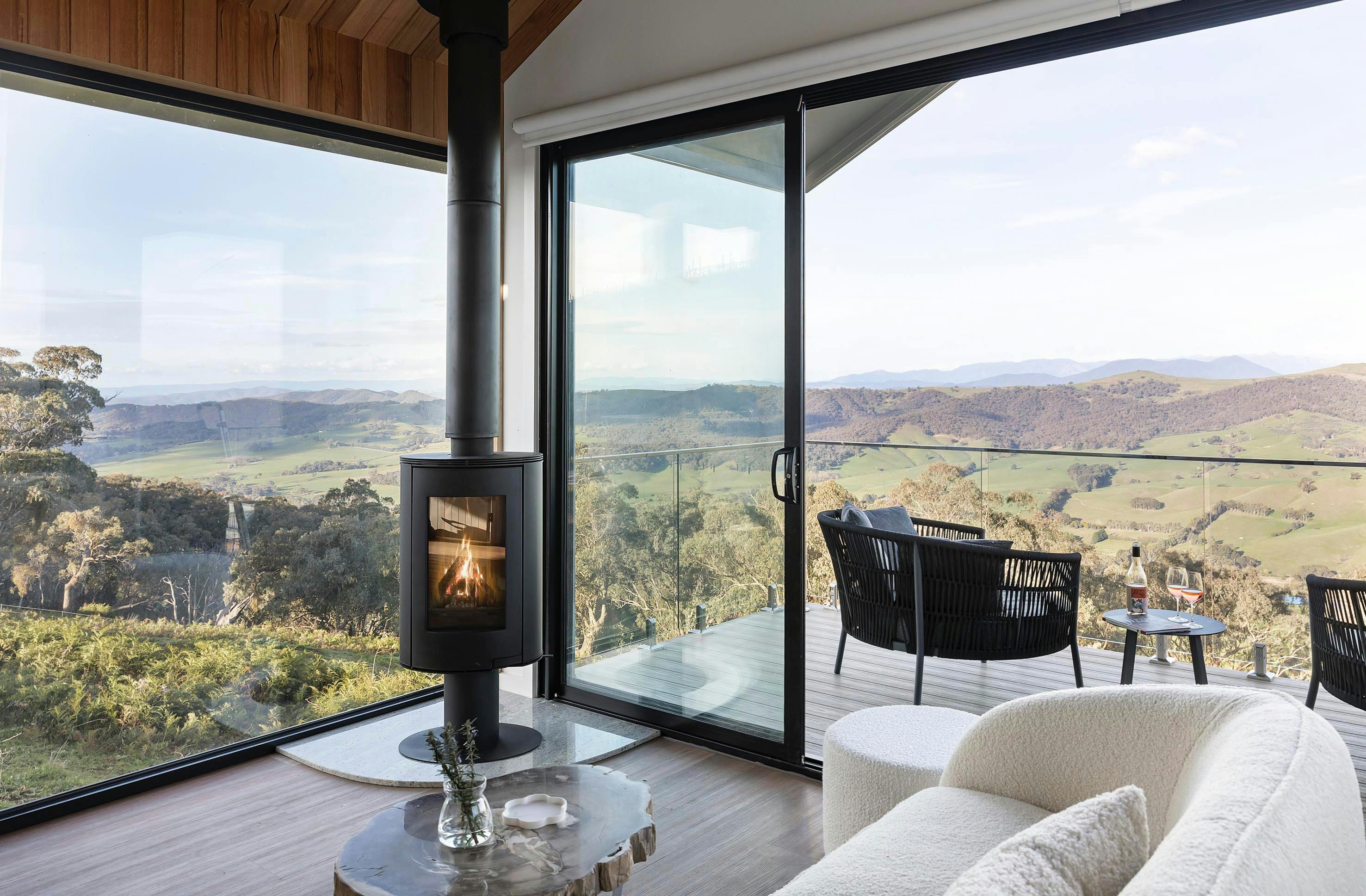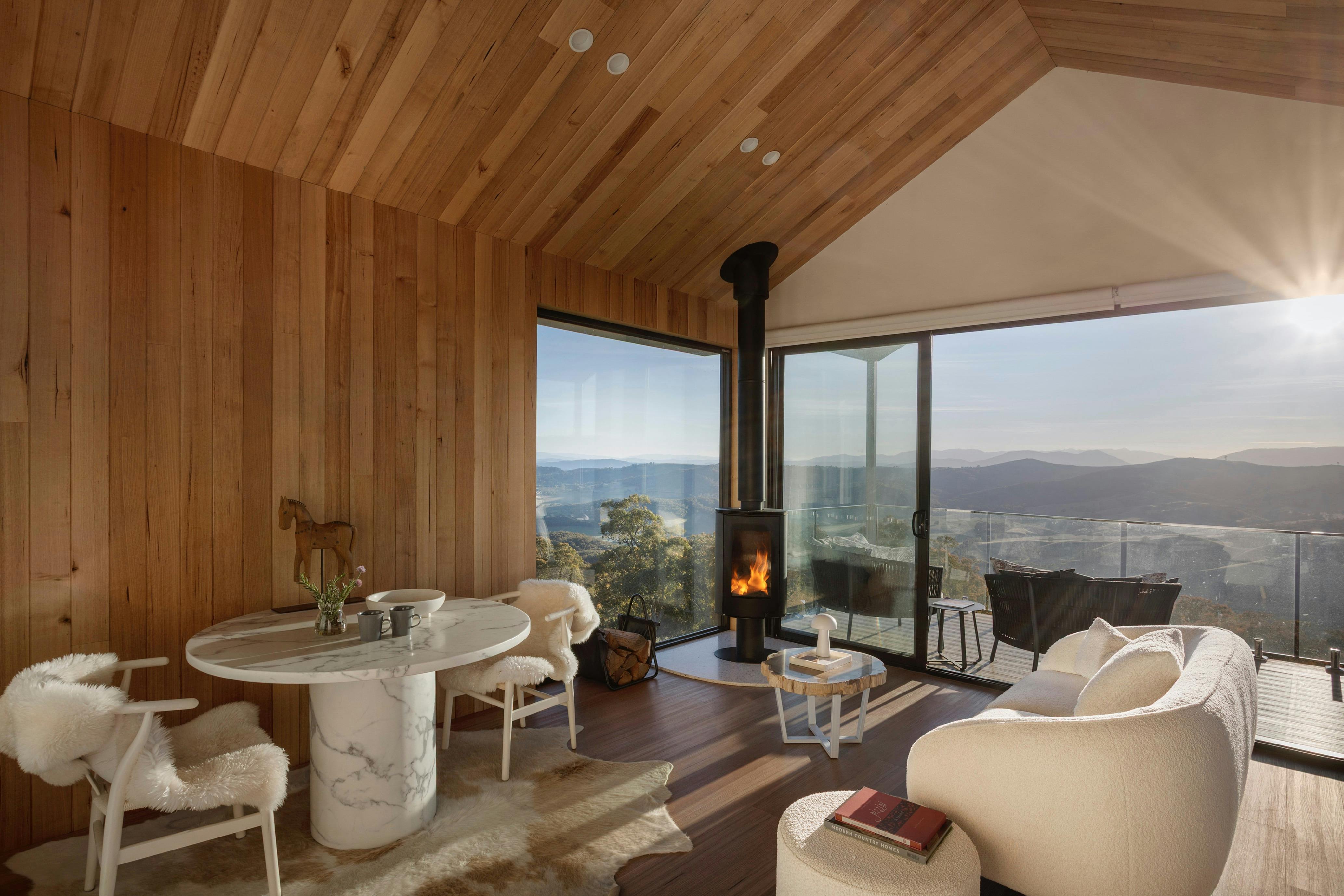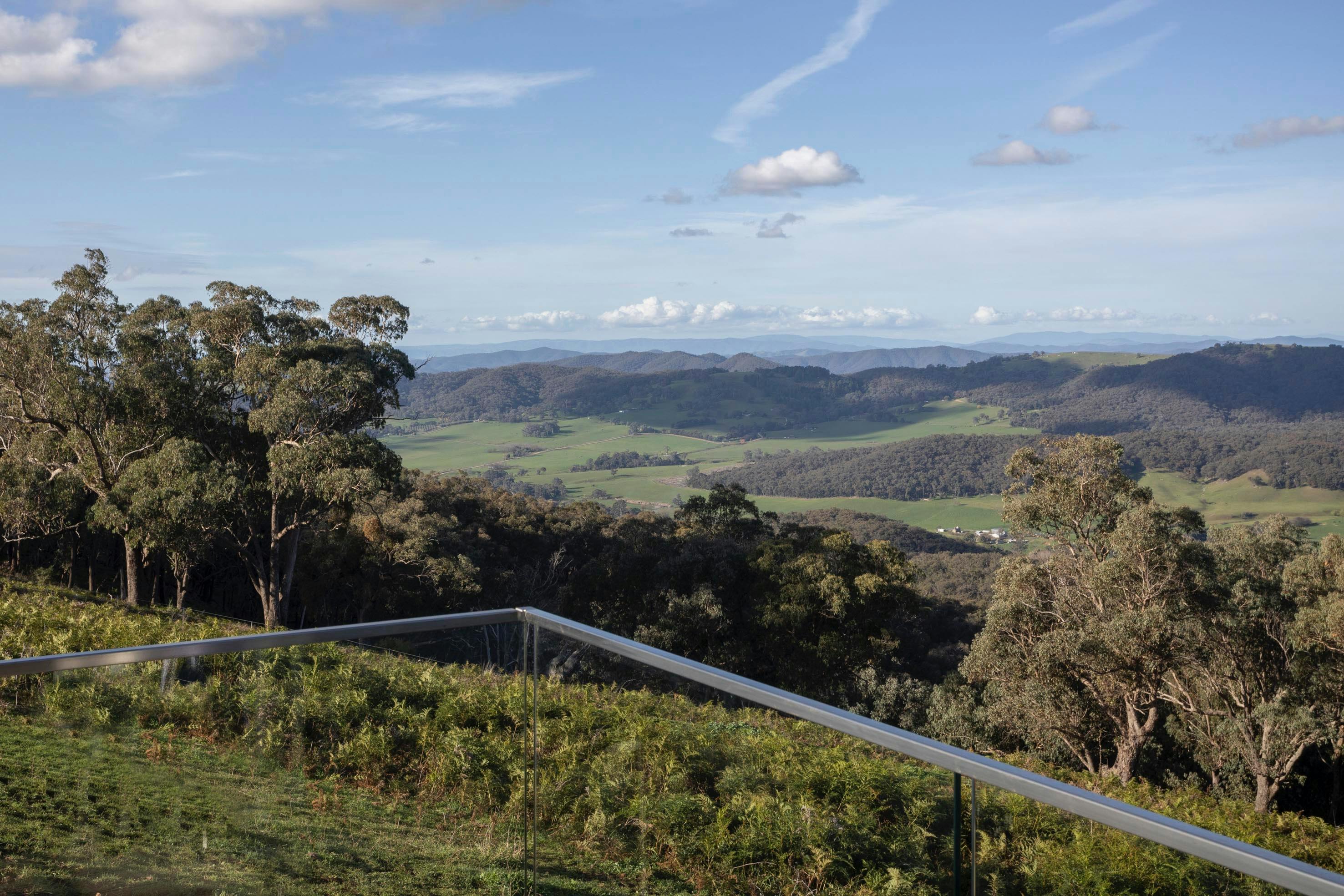 Large glazing throughout compliments a high pitched Tasmanian Oak lined ceiling. Winter snow capped view accross the King Valley to Mount Buffalo, and on a clear day Mount Stirling and Mount Buller. Throughout the year vineyard views - and a beautiful private setting looking out to the natural forest area and state park.