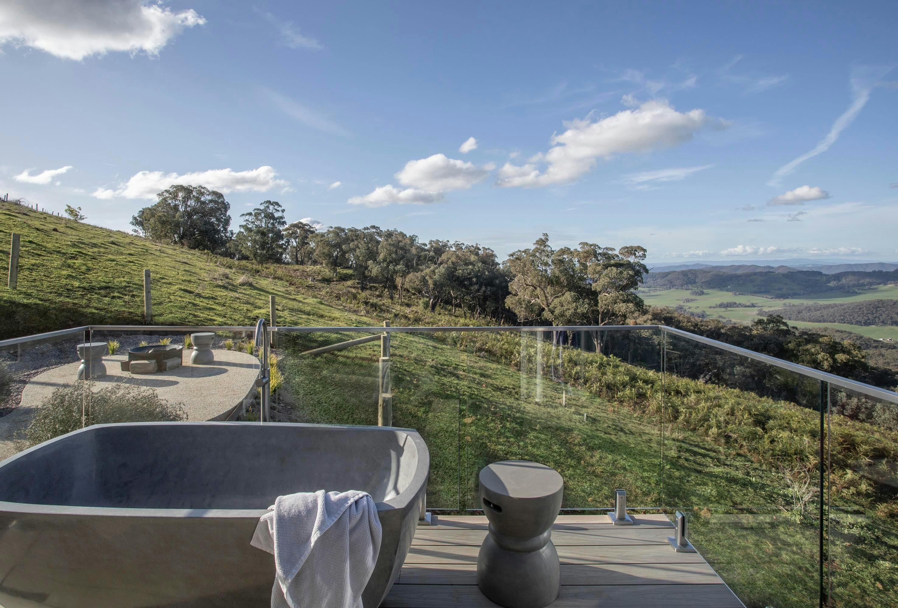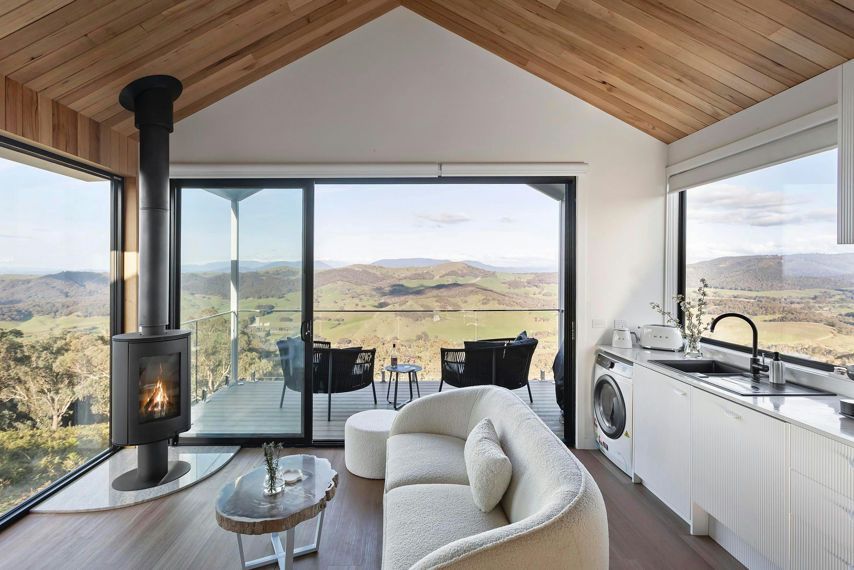 The second and larger balcony complete with a barbecue and ceiling fan enjoys luxurious outdoor seats and is cantilevered over the paddock to bring you up close to nature. The high ceilings continue into the bedroom that enjoys a concrete outdoor bath with views to the state park and alps.