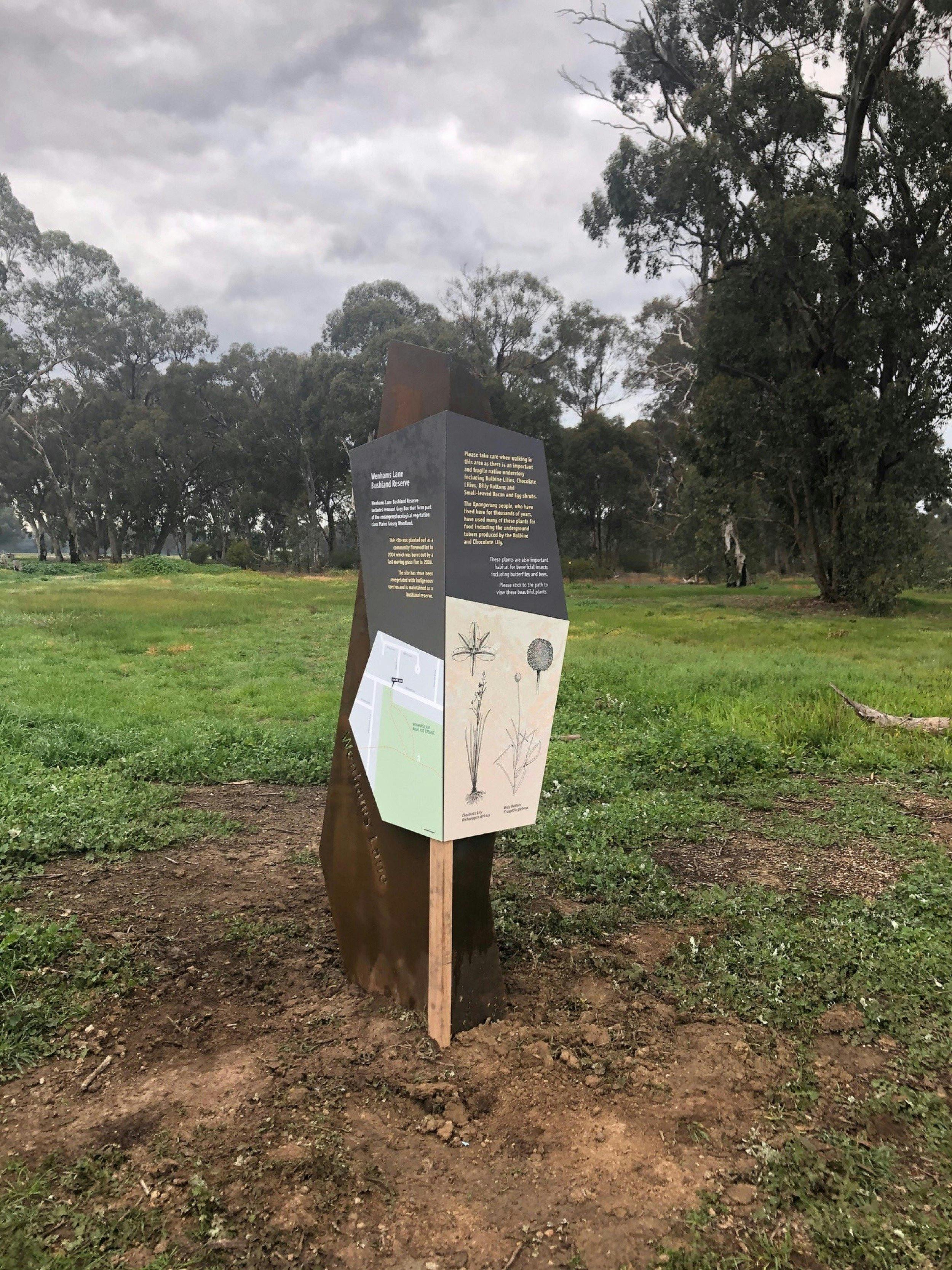 Wenhams Lane Bushland Reserve includes remnant Grey Box that form part of the endangered ecological vegetation class Plains Grassy Woodland. Enter the reserve from Wenhams Lane near the playground. This site was planted out as a community firewood lot in 2004 which was burnt out by a fast moving grass fire in 2006. The site has since been revegetated with indigenous species and is maintained as a bushland reserve. Please take care when walking in this area as there is an important and fragile native understory including Bulbine Lilies, Chocolate Lilies, Billy Buttons and Small-leaved Bacon and Egg shrubs. The Bpangerang people used many of these plants for food including the underground tubers produced by the Bulbine and Chocolate Lily. These plants are also important habitat for beneficial insects including butterflies and bees. Please stick to the path to view these beautiful plants. Head west on Wenhams Lane to link up with the One Mile Creek path.