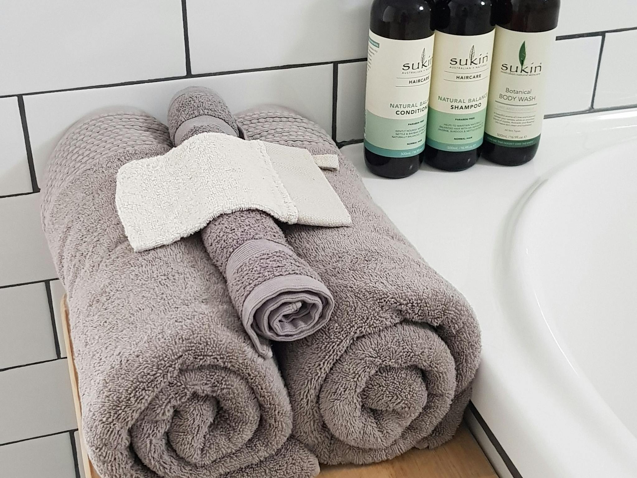 Modern bathroom with large corner bath, shower, toilet and vanity. 100 % Australian natural soap and hair products supplied.